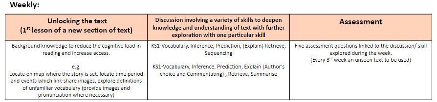 Daily lessons have a clear structure which is followed throughout school. The beginning of each session gives opportunities for reading fluency and strategies include: Teacher reading aloud, choral reading, echo reading, partner reading and silent reading. Rich discussion then takes place around the text before a reading skill is then focused upon and introduced to the children. This part of the lesson includes a teacher demonstration and a whole class discussion. Following this, children complete an activity where they have the opportunity to practise and explore this skill further. At the end of each daily session, children come back as a whole class and are presented with a question linked to the skill which they have explored. This gives them an opportunity to apply the skill in a reading comprehension format and understand how to transfer skills and formulate answers.
